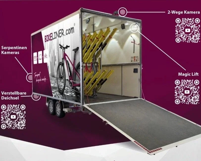 Ihre Fahrräder reisen sicher und komfortabel in unserem speziell entwickelten Radanhänger, der an unseren modernen Reisebus gekoppelt ist.